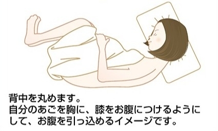 腰から背骨の中(にある脳脊髄液の中)に細い針を刺して麻酔薬を注入し、痛みを取り除くものです。横向き(下図参照)あるいは座った状態で行います。数分程度で足が動かせなくなり、腹部に向かってしびれが広がって痛みを感じなくなります。麻酔が十分に効いていることを確認してから手術を開始します。意識は保たれていますので、赤ちゃんの産声を聞いたり顔を見たりすることができます。手術後も2~3時間はしびれが残ります。