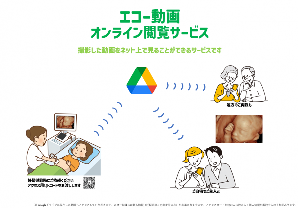 ご希望の方に、エコーの動画データをウェブ上(googleドライブ)にアップロードいたします。スマホやタブレット、PCを使ってご自宅でご主人と視聴したり、データをダウンロードしたりすることが可能です。ネット環境があればどこでも視聴できますので、遠隔地のご両親やご親戚が生まれる前の赤ちゃんを見ることもできます。2026年3月までは無料でご利用いただけます。