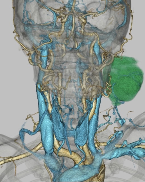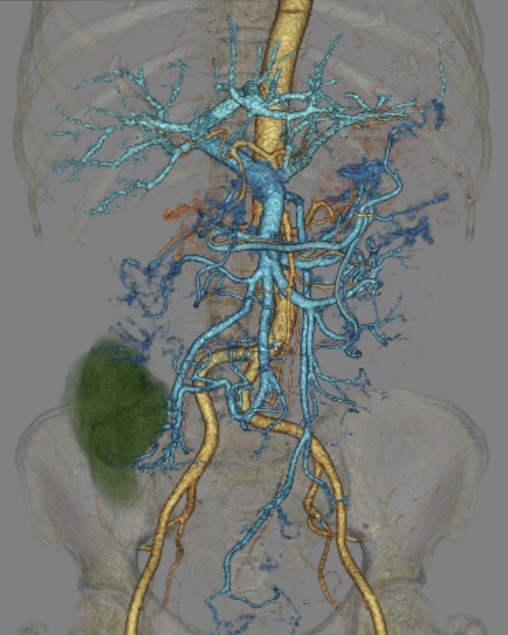 術前には造影剤を併用し、大腸、血管、腫瘍の画像をFusion(重ね合わせ)する事によって、術前シミュレーションを行う場合もあります。