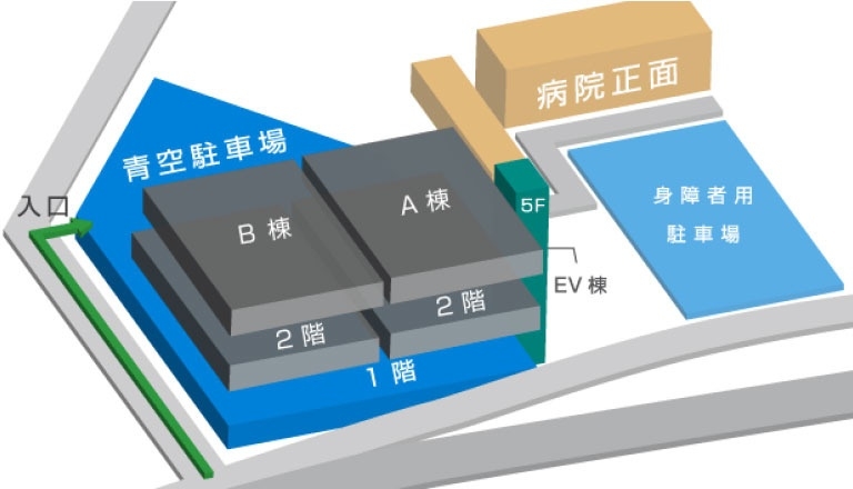病院正面向って左に、立体駐車場がございます。患者さんや面会の方がご利用できるのは、立体駐車場のうちA棟1階、B棟1階、青空駐車場となります。