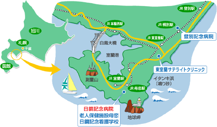 - 「東室蘭駅」下車後、道南バス「日鋼記念病院前」下車(道南バスは東室蘭駅東口ならびに東町ターミナルから乗車可能)