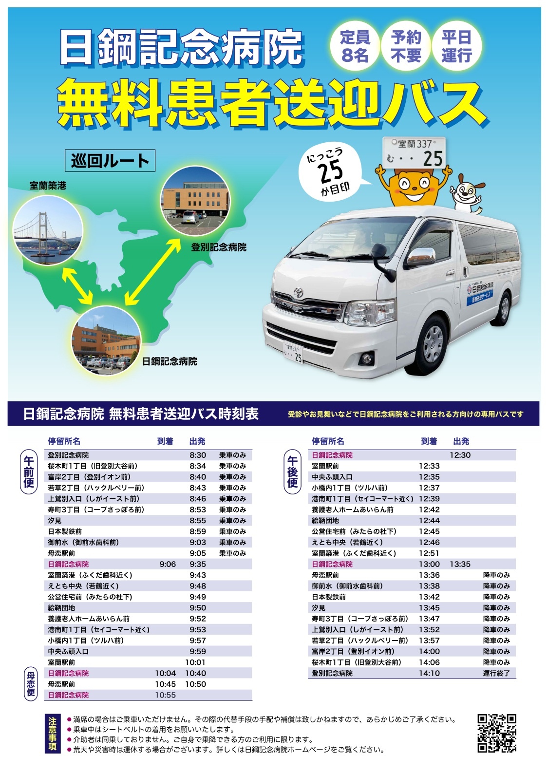 荒天や災害発生時は運休する場合がございます。詳しくは日鋼記念病院ホームページをご覧ください。