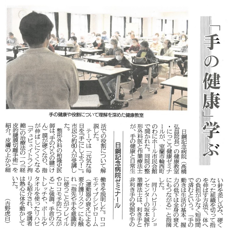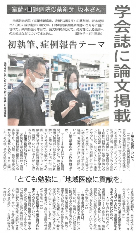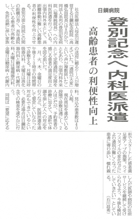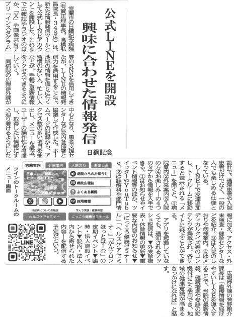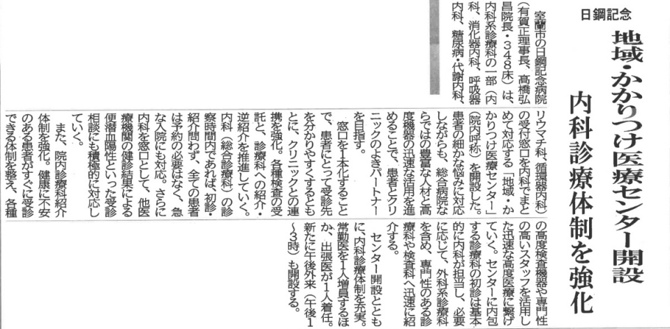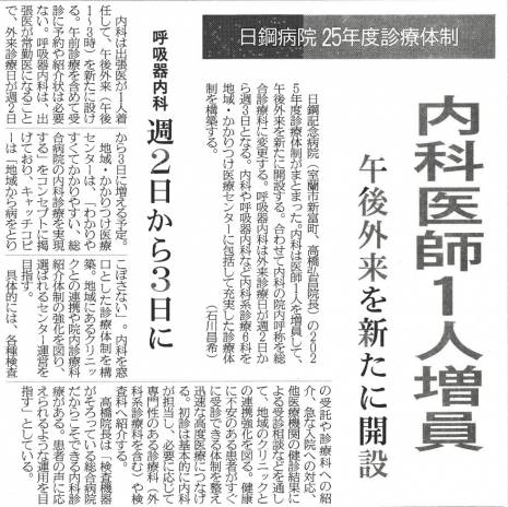 新聞・雑誌等に掲載された日鋼記念病院に関する記事を掲載しています。上記見出しタブは項目ごとに並んでおりますので、横スクロールして、見たい内容をタップしてご覧ください。新聞記事はタップすると大きくなります。