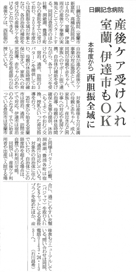 当院の産後ケア 西胆振全域で補助対象に