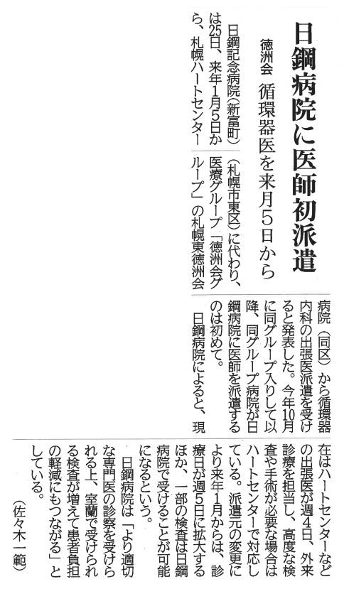 登別記念病院へ内科医を派遣