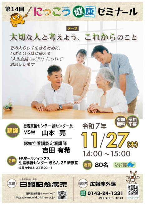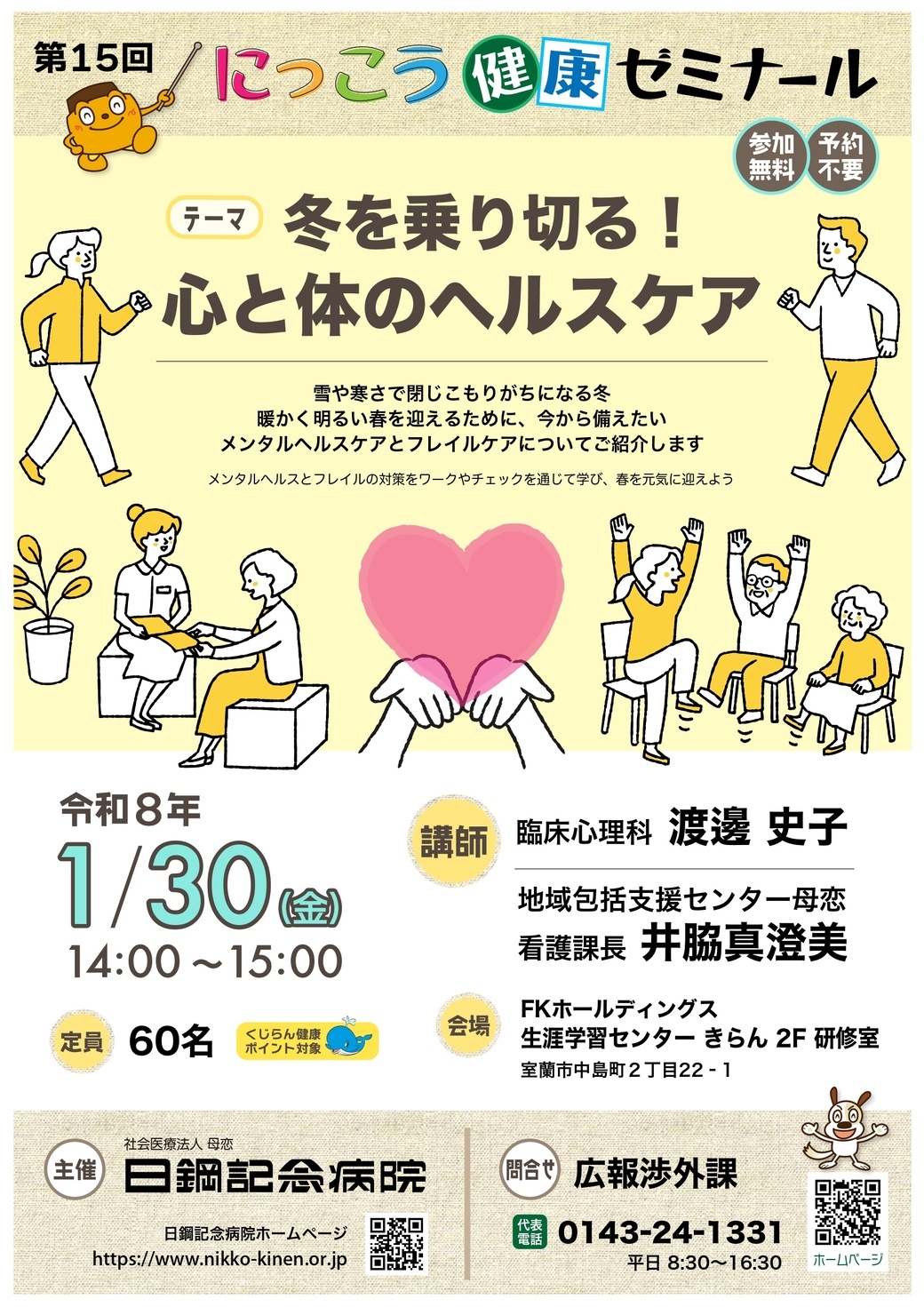 病気予防・健康増進に役立つ医療情報から、家計に役立つ情報や病院の取り組みなど…日鋼記念病院のさまざまな職種のスタッフが、病院を飛び出して地域の皆さまへ健康情報をお伝えする「健康教室」です。