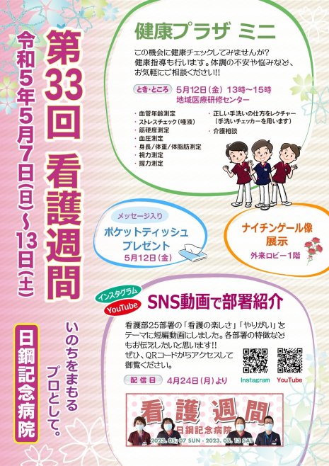 当院広報誌「日鋼記念メディカル情報」5月号誌面にて、看護週間についての記事を掲載します。当院看護師の仕事の様子も紹介します。