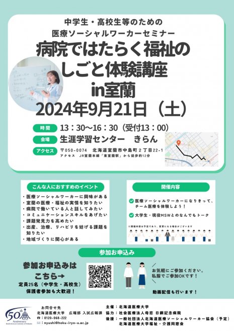 2024年9月21日(土)病院ではたらく福祉のしごと体験講座 in 室蘭に当院スタッフが参加します(終了しました)
