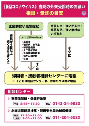 ● お手数でも帰国者・接触者センターからご紹介いただいた旨をご一報のうえ、ご来院くださいますようお願い申し上げます。