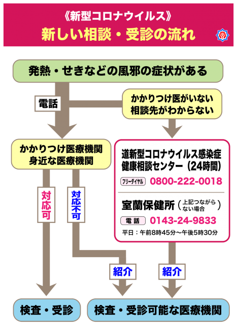 発熱などの症状がある方は、まずは、かかりつけ医などの身近な医療機関に電話で相談してください。 相談する医療機関に迷う場合には、「北海道新型コロナウイルス感染症健康相談センター」に電話で相談してください。