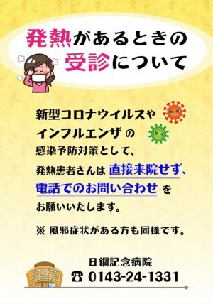 発熱があるとき、風邪症状があるときは直接来院せず、事前に電話でのお問合せをお願いいたします。 新型コロナウイルス・インフルエンザ感染の予防対策としてご協力をお願いいたします。