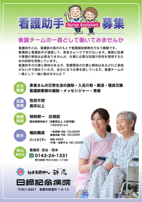 看護助手の仕事に興味のある方、医療関係の仕事に興味はあるけれど資格がないのであきらめていた方、自分に合う仕事を探している方、看護チームの一員として一緒に働きませんか?