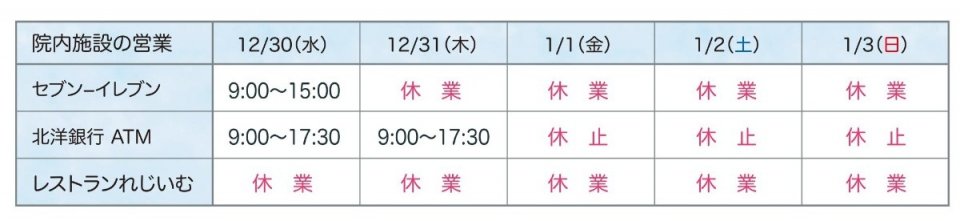 12月30日(水)~1月3日(日)の間、外来診療を休診とさせていただきます。