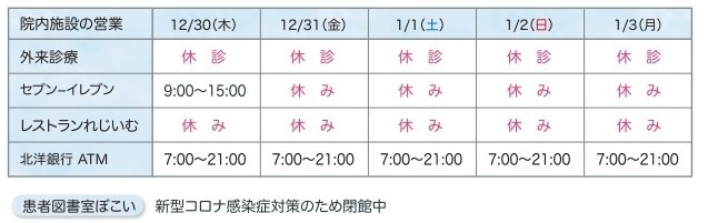 12月30日(木)~1月3日(月)の間、外来診療を休診とさせていただきます。 救急外来診療は行っておりますが、発熱・風邪症状がある場合は必ず、事前に電話でご相談の上、来院くださいますようご協力をお願い申し上げます。 1月4日(金)より平常診療となります。