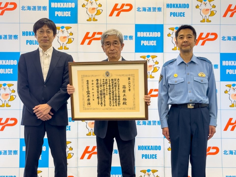 警察協力章は警察庁長官から民間人に贈られる表彰としては最高位となり、2024年は全国で41名、北海道では2名が対象となっています。今回の表彰は、篠原医師の北海道警察 室蘭警察署の警察医としての長年にわたる功績が認められたものです。伝達式では、北海道警察本部長より賞状およびメダルが授与されました。